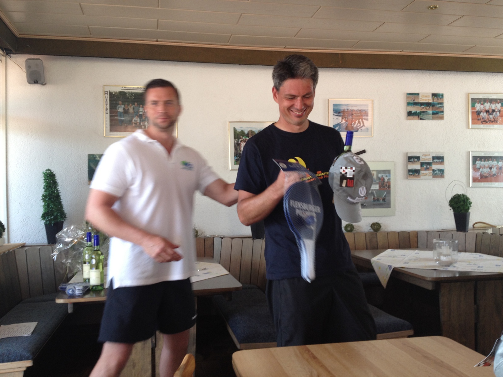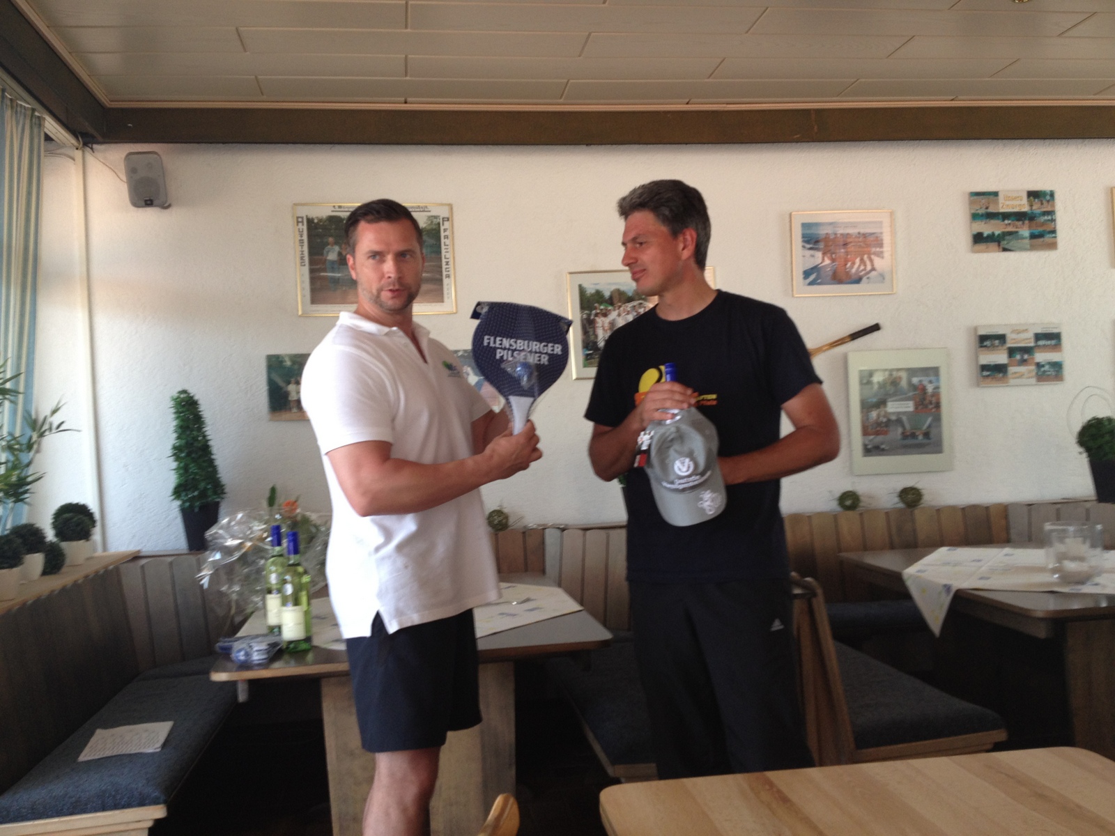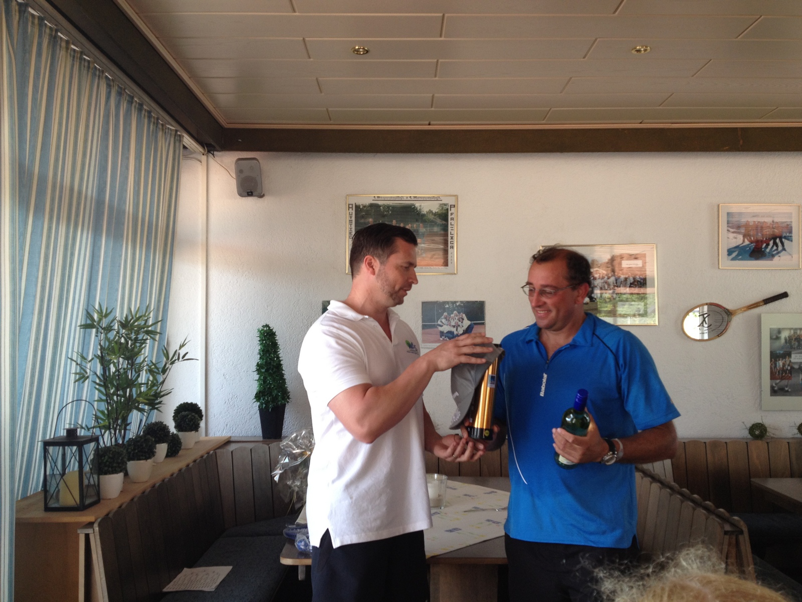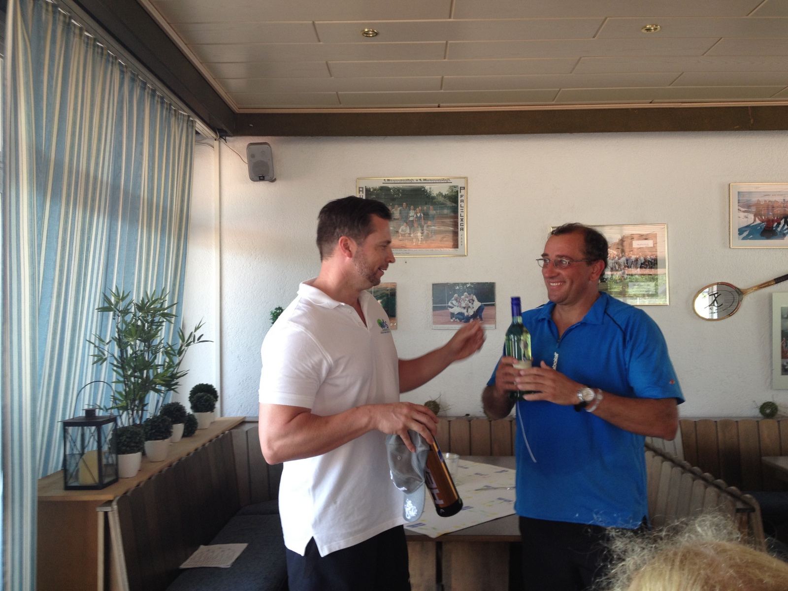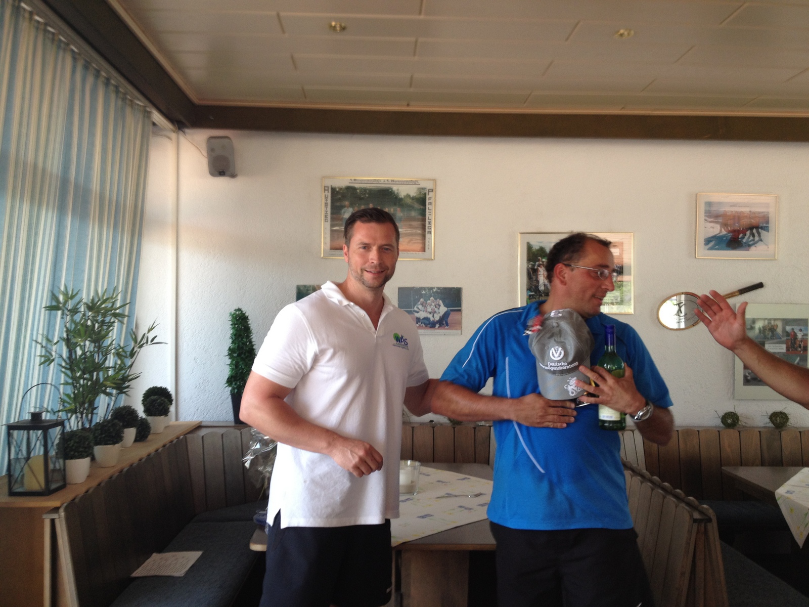 Wir haben einen neuen Clubmeister! Nach 2 wöchigem Wettkampf unter 28 Teilnehmerinnen und Teilnehmern in teilweise hauchdünnen Auseinandersetzungen auf dem Tennisplatz trafen sich am Sonntag die Finalisten der Herrenbegegnungen. Unter den Augen zahlreicher Zuschauer konnte sich im Endspiel der Nebenrunde Salih Can Arioglu gegen Uwe Kempf mit 6:2 und 6:1 durchsetzen. Ein Zeichen dafür, dass die Jugendarbeit des TCW Früchte trägt. Das Endspiel der Hauptrunde bestritten, wie von vielen vorausgesagt, die langjährigen Leistungsträger des Vereins, die uns auch bei größeren Turnieren immer wieder sportlich vertreten, Markus Rudolph und Axel Schulz. Nach fast 2 Stunden höchst unterhaltsamem Sport und mitreisenden Ballwechseln konnte sich letztendlich Axel knapp mit 7:5 und 6:4 durchsetzen. Seine „Krönung“ in der anschließenden Siegerehrung nahm unser 1. Vorsitzender Axel Schmitz vor und überreichte auch den anderen genannten Spielern Sachpreise, die unsere Sponsoren freundlicherweise zur Verfügung stellten.