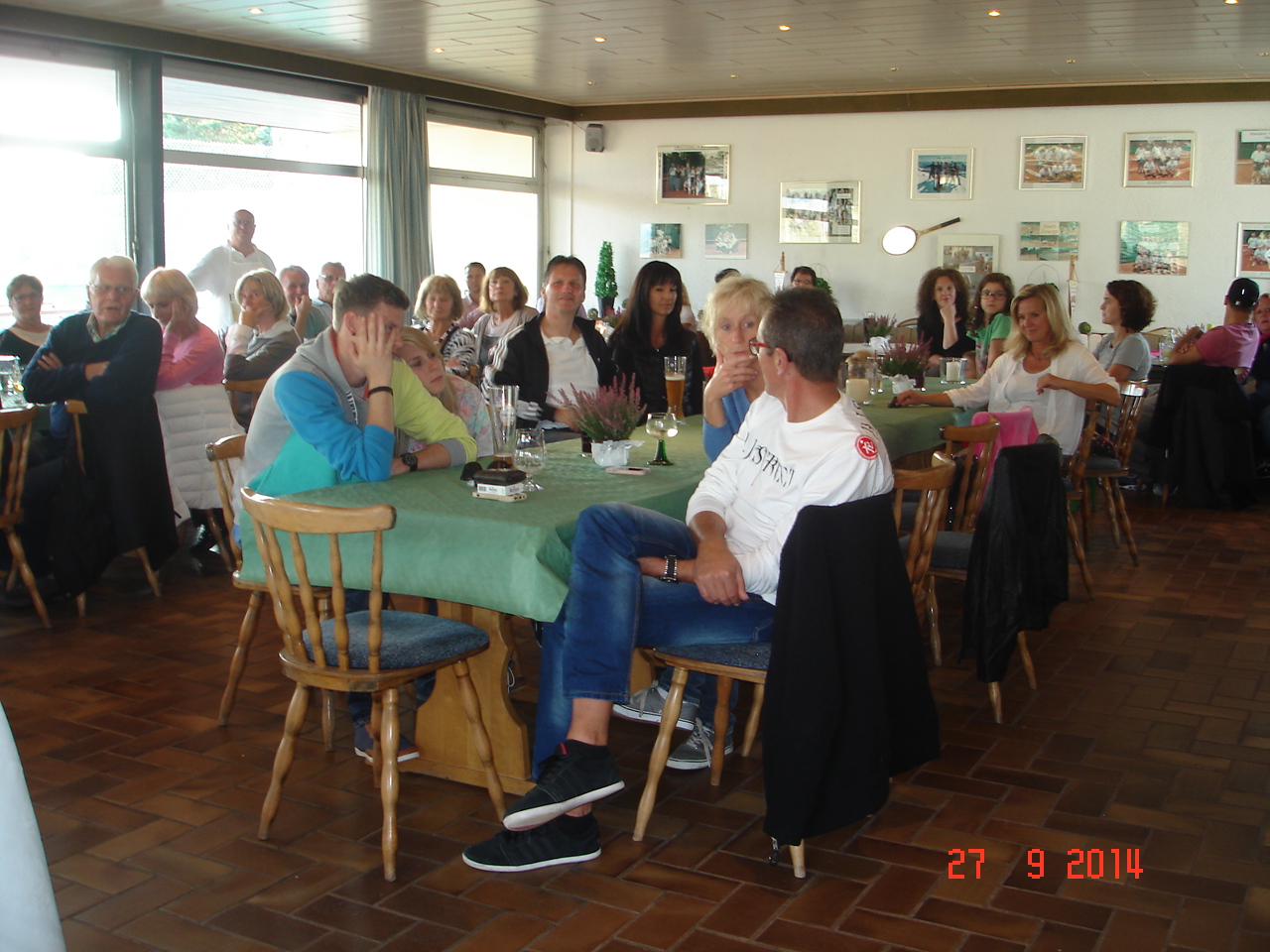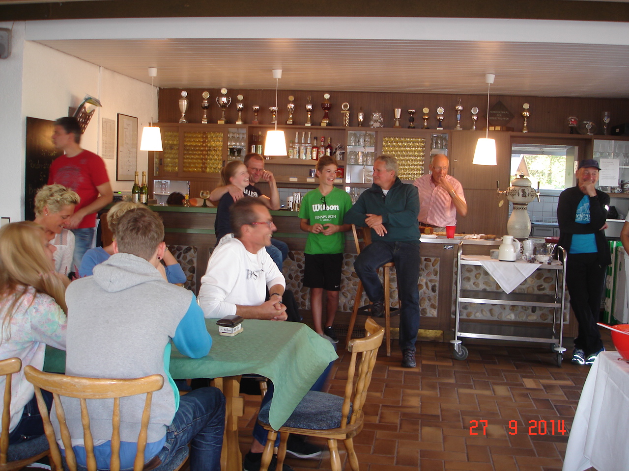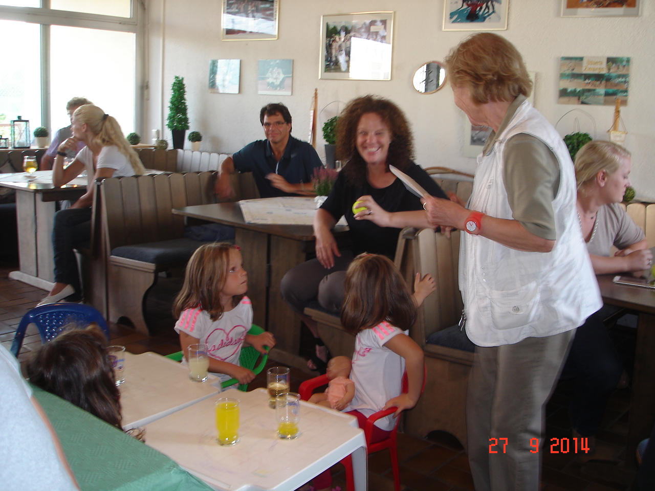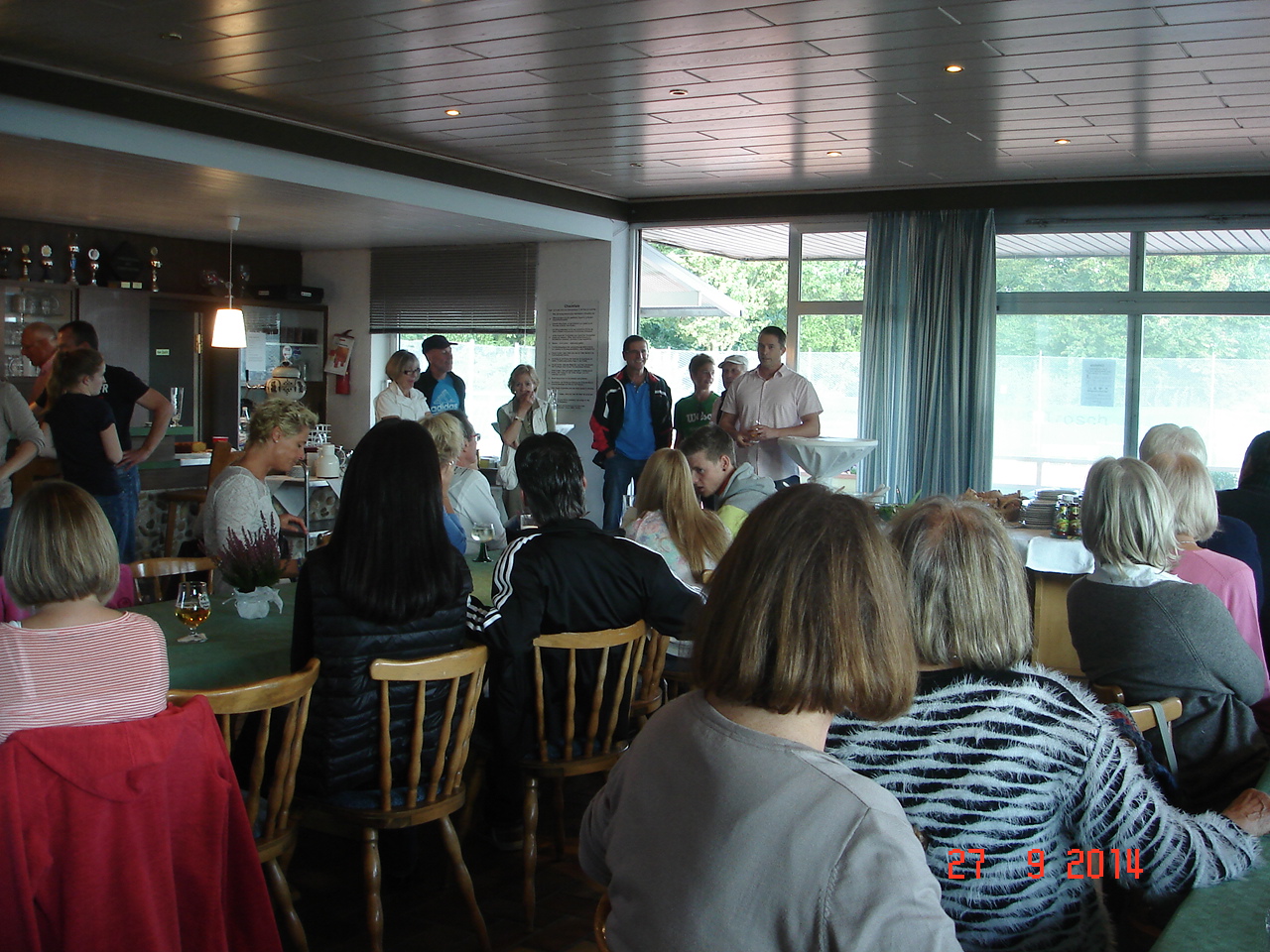 m 13.00 wollten wir eigentlich mit dem traditionellen Schleifchenturnier zum Abschluß der Saison beginnen. Das war gar nicht so einfach, denn es hatten sich 28 Teilnehmer gemeldet ! Das hat es in all den Jahren noch nicht gegeben - und es waren tatsächlich Alle gekommen ! Das hatte es auch noch nicht gegeben ! Das war natürlich Grund zur Freude, zumal es eine wunderbare Mischung aus jung - mittel - und alt ( pardon !!! ) war. Aber nun mußte auch getüfftelt werden, denn wie wir wissen hat der Club nur 5 Plätze - also, wenn Doppel, bzw.in diesem Fall Mixed gespielt wird - geht das nur für 20 Spielerinnen und Spieler. Also mußte ein System gefunden werden, bei dem niemand allzulange pausieren sollte. Und dieses geniale System hat, wie so oft und stets bewundert Karl Towae ausgedacht. Es hat wunderbar funktioniert ! - Alle konnten 5 Runden spielen ; die Wartenden durften sich entweder ein Gläschen Sekt genehmigen, das erste spendiert vom ersten Vorsitzenden Axel Schmitz, oder sich bei Kaffee und Kuchen - wie immer großzügig gespendet von unseren Mitgliedern - für die nächsten Runden stärken.
