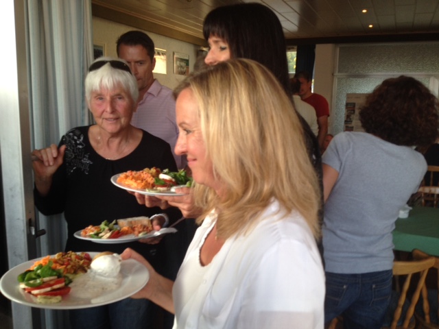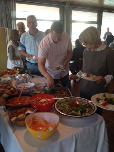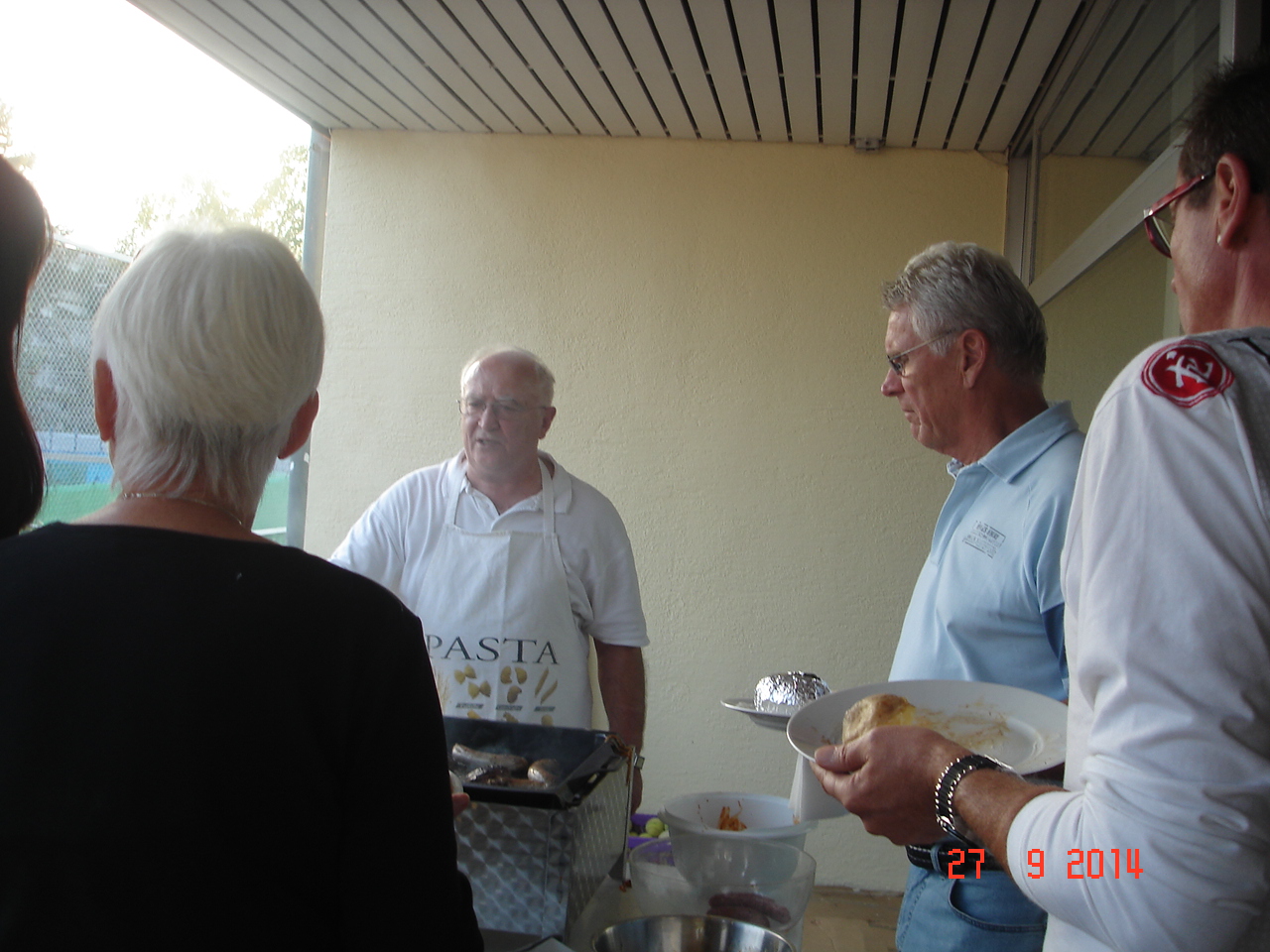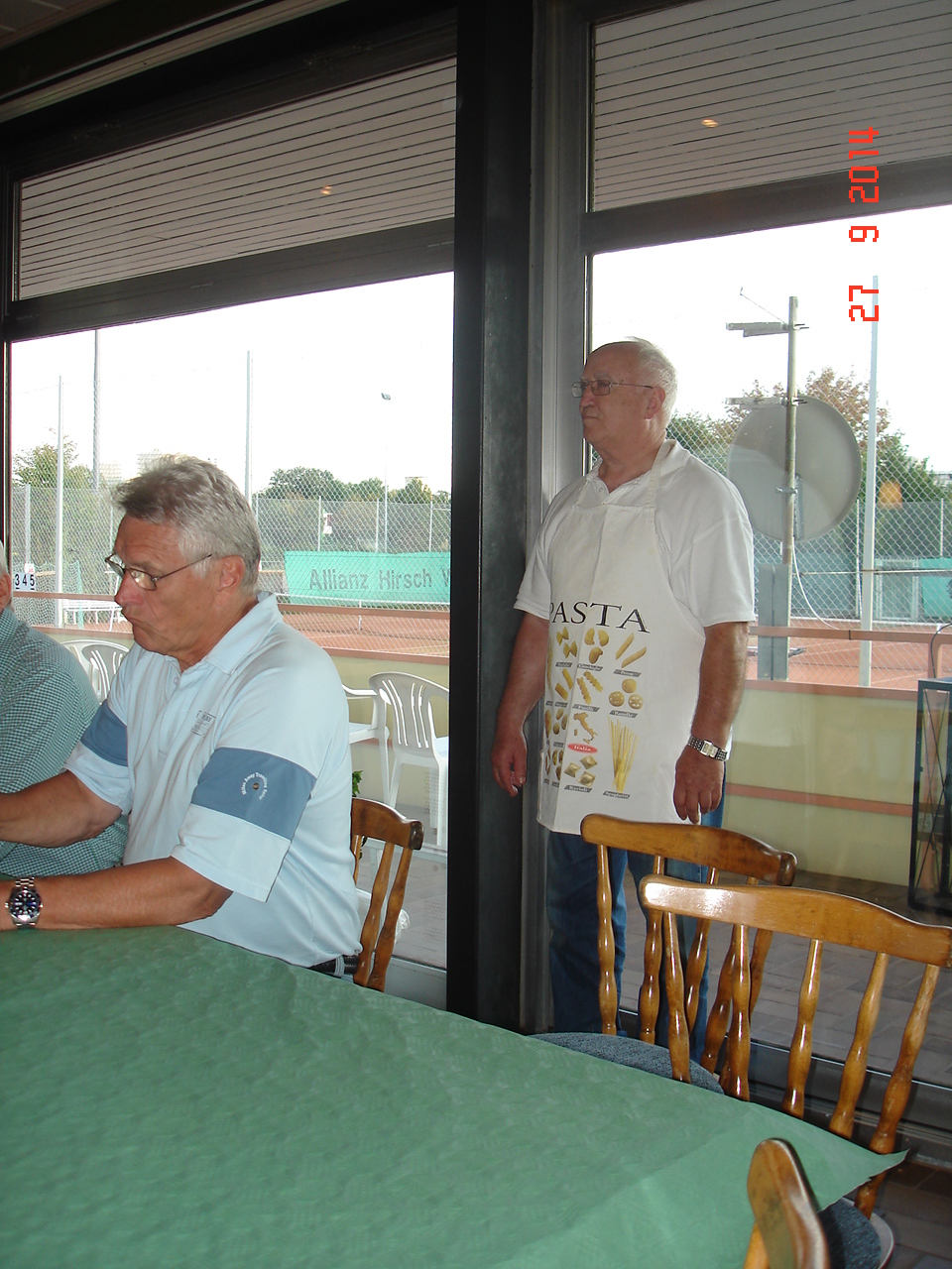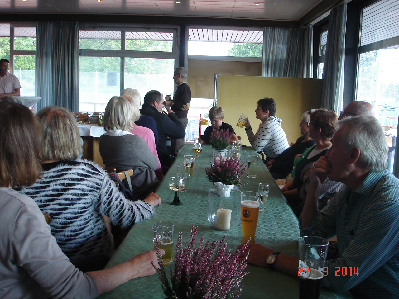 m 13.00 wollten wir eigentlich mit dem traditionellen Schleifchenturnier zum Abschluß der Saison beginnen. Das war gar nicht so einfach, denn es hatten sich 28 Teilnehmer gemeldet ! Das hat es in all den Jahren noch nicht gegeben - und es waren tatsächlich Alle gekommen ! Das hatte es auch noch nicht gegeben ! Das war natürlich Grund zur Freude, zumal es eine wunderbare Mischung aus jung - mittel - und alt ( pardon !!! ) war. Aber nun mußte auch getüfftelt werden, denn wie wir wissen hat der Club nur 5 Plätze - also, wenn Doppel, bzw.in diesem Fall Mixed gespielt wird - geht das nur für 20 Spielerinnen und Spieler. Also mußte ein System gefunden werden, bei dem niemand allzulange pausieren sollte. Und dieses geniale System hat, wie so oft und stets bewundert Karl Towae ausgedacht. Es hat wunderbar funktioniert ! - Alle konnten 5 Runden spielen ; die Wartenden durften sich entweder ein Gläschen Sekt genehmigen, das erste spendiert vom ersten Vorsitzenden Axel Schmitz, oder sich bei Kaffee und Kuchen - wie immer großzügig gespendet von unseren Mitgliedern - für die nächsten Runden stärken.