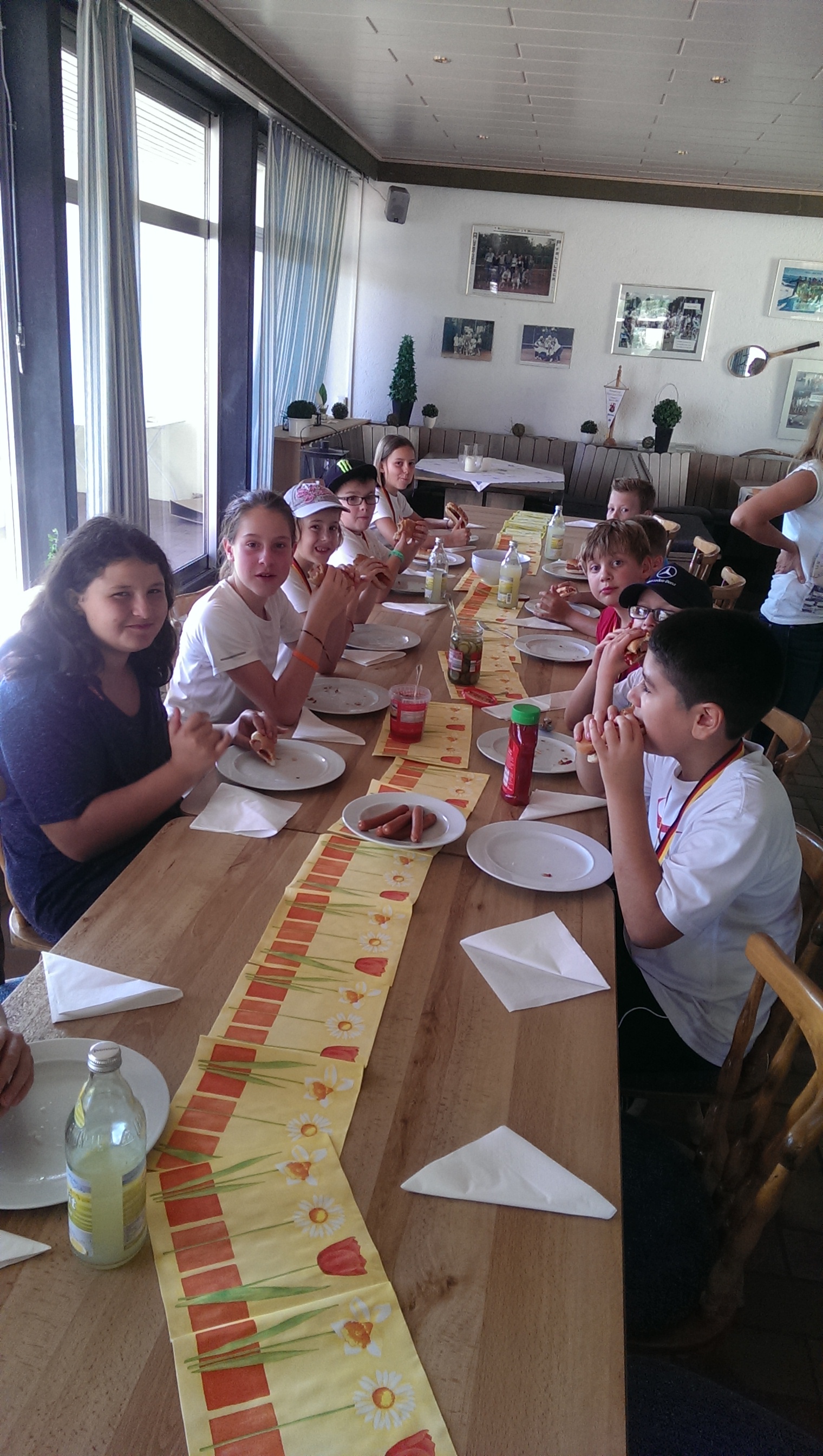 Nach den anstrengenden Spielen wurde den Kindern, dankenswerter Weise durch den Wirtschaftsdienst, leckere Hot-Dogs auf den Tisch gezaubert. Großen Dank gebührt hier Katrin Mittenbühler und Ewa Pfirrmann.