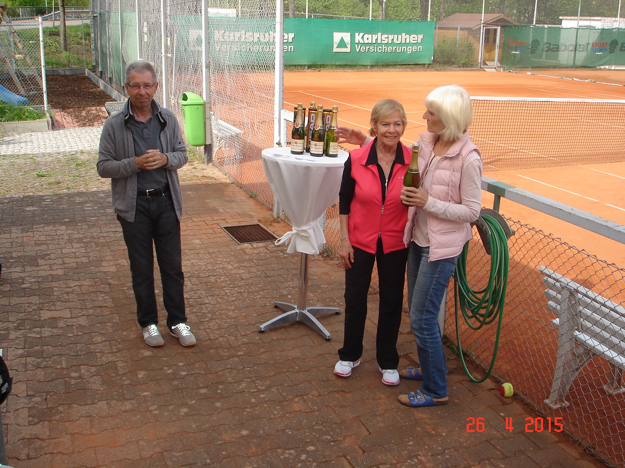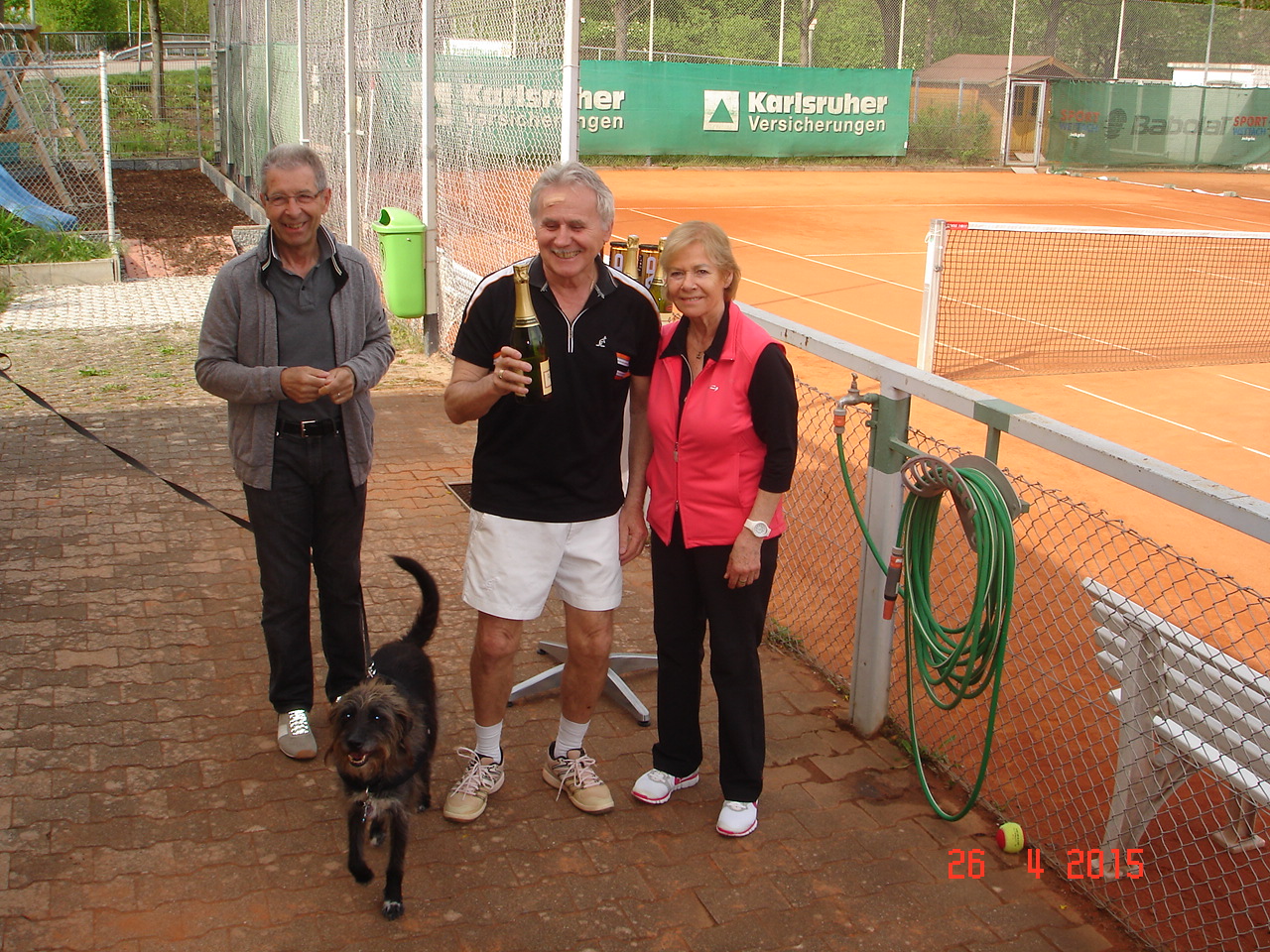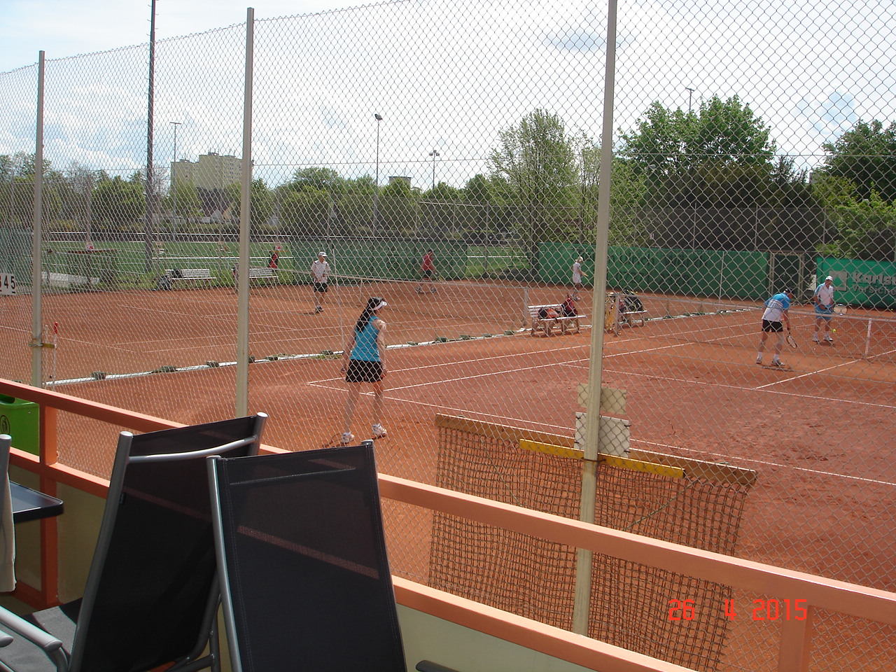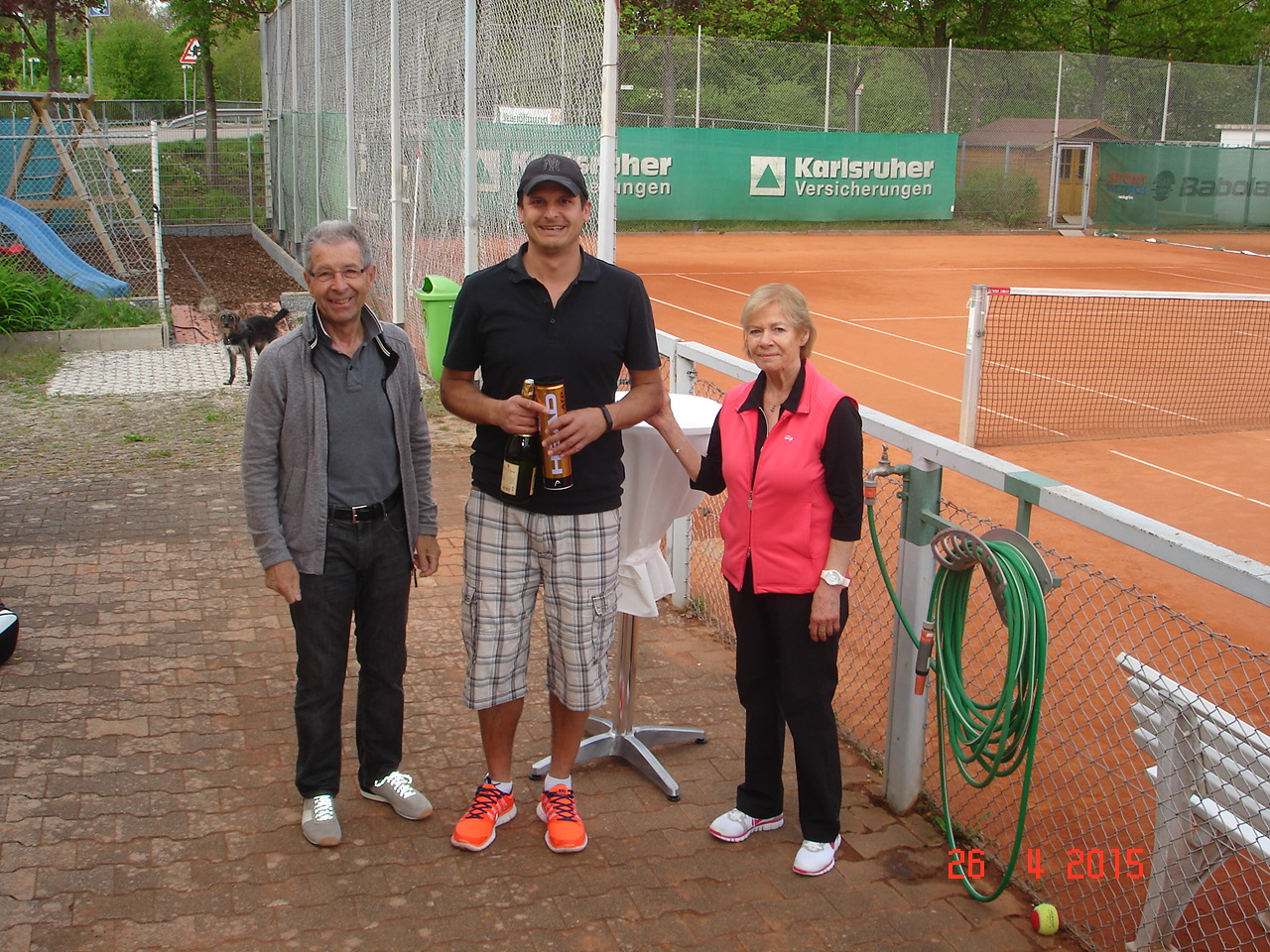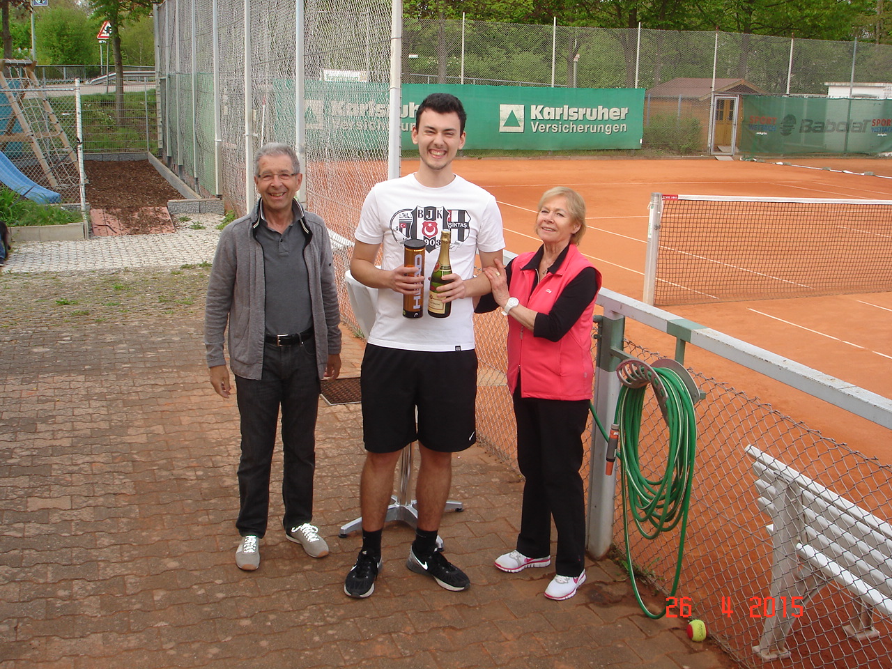 Um 12.30 ging es dann endlich los, die ersten scharrten schon mit den Hufen und schwangen bedrohlich ihre Schläger. Die Spielerpaarungen wurden ausgelost, leider musste immer ein Paar eine Runde aussetzen. Nach kurzer Einspielzeit wurde es „Ernst“, alle waren bis in die Zehenspitzen hochmotiviert und gaben ihr Bestes. Nach jeweils 25 Spielminuten wurden die Paarungen getrennt, wobei das Siegerpaar jeweils ein Schleifchen erhielt und getrennt auf dem Platz verblieb, das Verliererpaar trabte zum nächsten Platz. Nach 3 Runden waren die Akkus leer und mussten bei Kaffee und Kuchen wieder aufgeladen werden. Um 16.00, nach 6 Runden standen die Sieger fest. Bei den Herren konnten sich punktgleich die ungekrönten Sandplatzkönige Salih Can Arioglu und Thomas Bütenmeister mit den meisten Schleifchen durchsetzen, gefolgt von Gerhard Dischler. Bei den Damen waren Ulla Jung und Heiderose Kraus am erfolgreichsten.