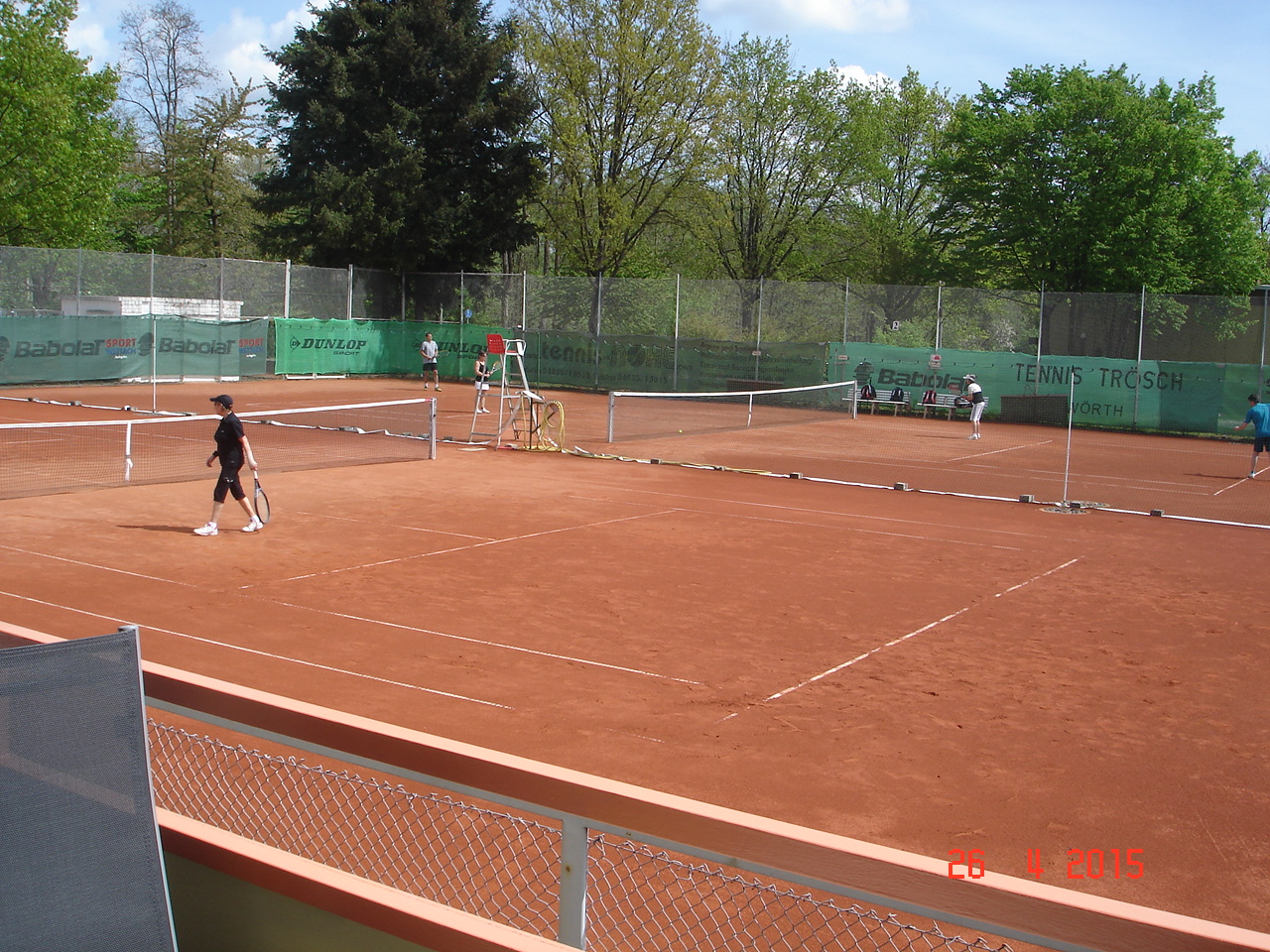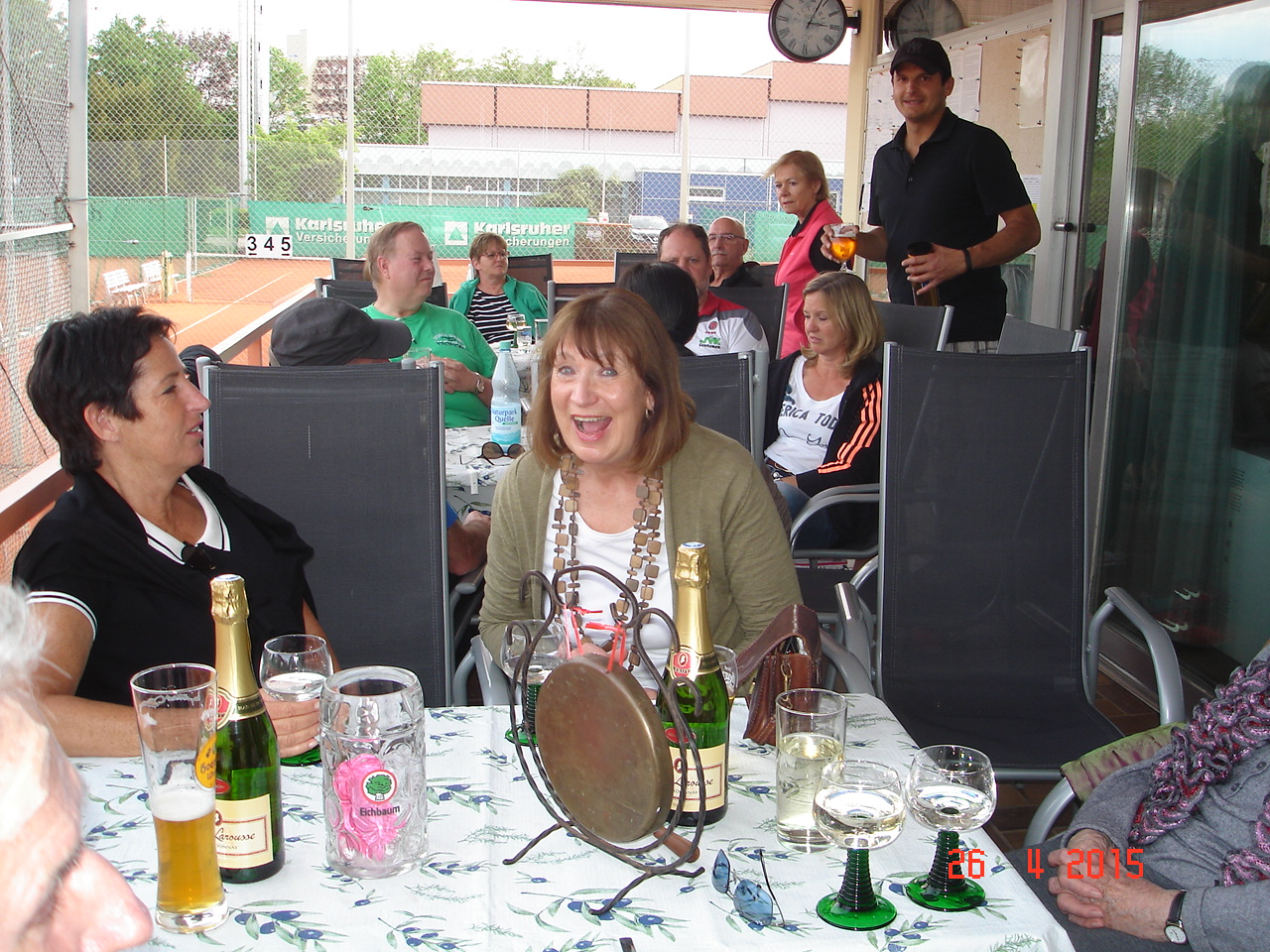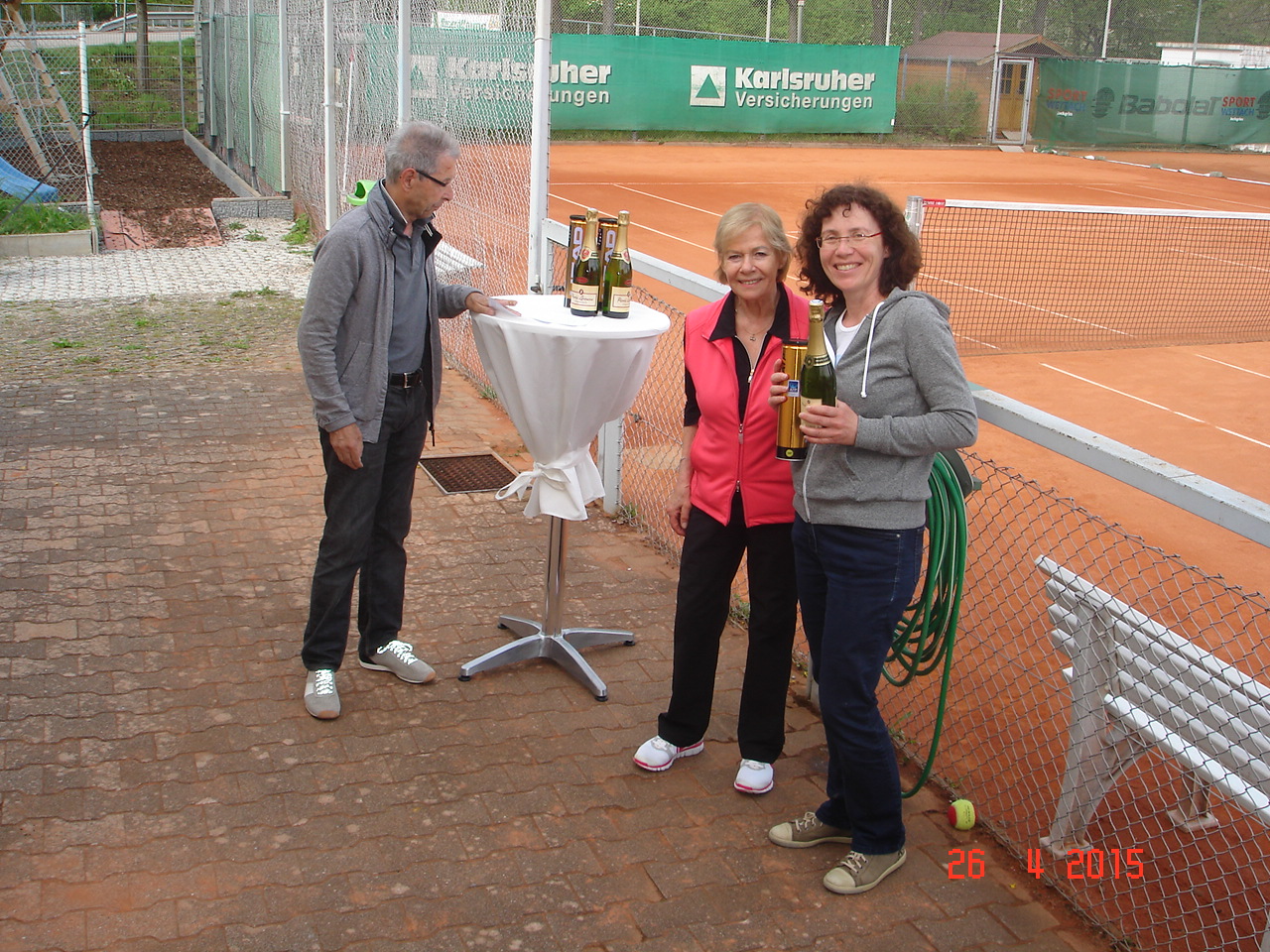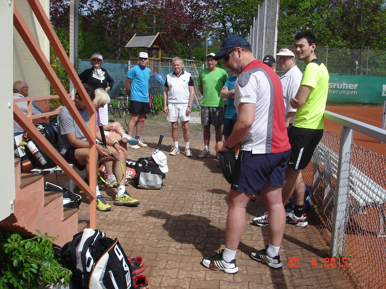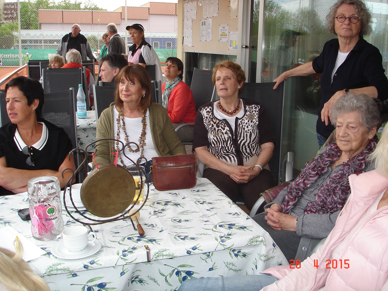 Um 12.30 ging es dann endlich los, die ersten scharrten schon mit den Hufen und schwangen bedrohlich ihre Schläger. Die Spielerpaarungen wurden ausgelost, leider musste immer ein Paar eine Runde aussetzen. Nach kurzer Einspielzeit wurde es „Ernst“, alle waren bis in die Zehenspitzen hochmotiviert und gaben ihr Bestes. Nach jeweils 25 Spielminuten wurden die Paarungen getrennt, wobei das Siegerpaar jeweils ein Schleifchen erhielt und getrennt auf dem Platz verblieb, das Verliererpaar trabte zum nächsten Platz. Nach 3 Runden waren die Akkus leer und mussten bei Kaffee und Kuchen wieder aufgeladen werden. Um 16.00, nach 6 Runden standen die Sieger fest. Bei den Herren konnten sich punktgleich die ungekrönten Sandplatzkönige Salih Can Arioglu und Thomas Bütenmeister mit den meisten Schleifchen durchsetzen, gefolgt von Gerhard Dischler. Bei den Damen waren Ulla Jung und Heiderose Kraus am erfolgreichsten.