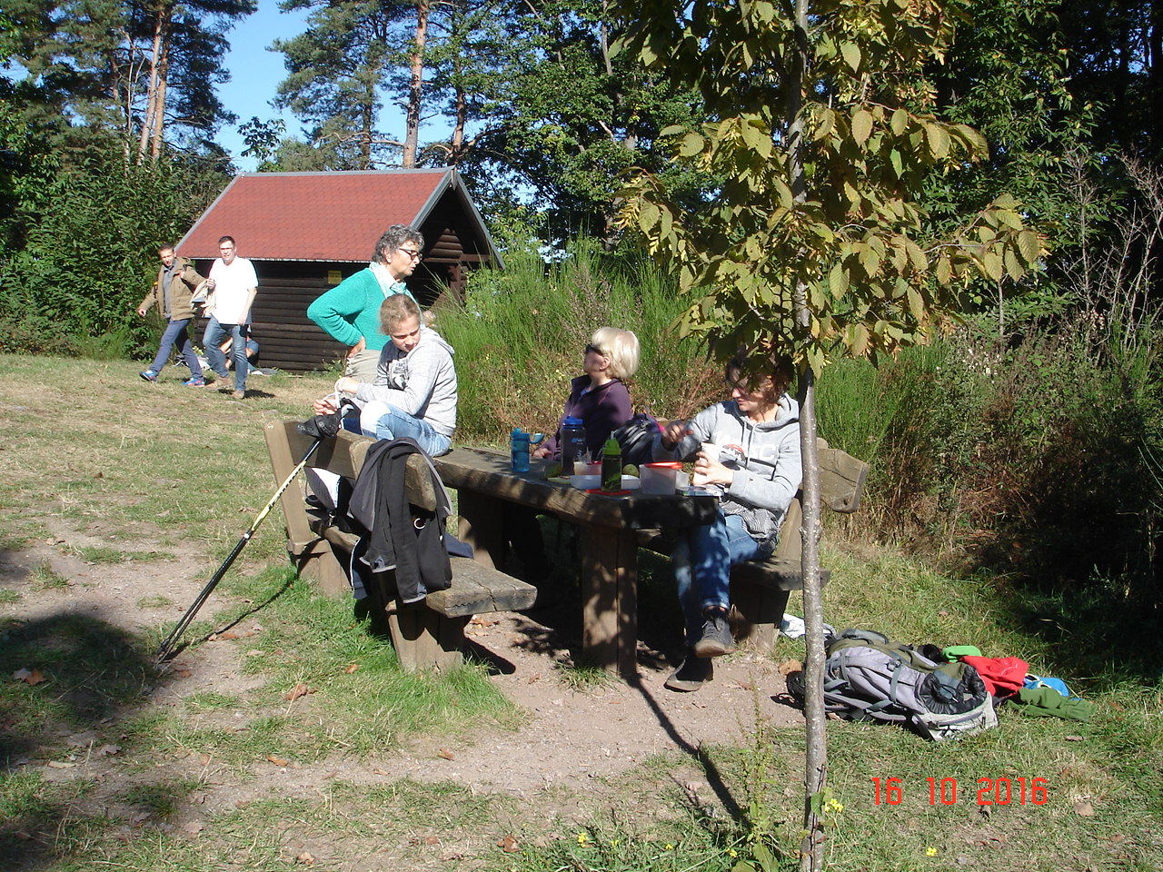 So begaben sich die 9 Teilnehmer in dem gut beschilderten Wandergebiet auf dem gemächlich ansteigenden Rundweg durch den bunten Herbstwald in Richtung Kolmerbergkapelle. Schon bald begleiteten uns auch die Sonnenstrahlen und auf dem Waldboden frisch gefallene und sehr große Esskastanien. Für Einige von uns war die Versuchung zu groß und so beschwerten sie frühzeitig damit ihr Wandergepäck. Dies war sowieso etwas umfangreicher; denn im Rucksack denn befand sich auch Essen und Trinken für unterwegs, da in diesem Waldgebiet leider keine Pfälzer- Wald- Hütte zu finden ist. Nach einer Stunde war die, auf 395 m gelegene Kolmerbergkapelle, erreicht. Sie ist eine beliebte Wallfahrtskappelle, deren Anfänge in das Jahr 1470 zurückgehen. Jedes Jahr werden immer noch an diesem schönen Platz im Wald Wallfahrtsfeste gefeiert. Nach einer kurzen Pause ging es weiter in Richtung Stäffelsbergturm. Dort angekommen, freute man sich auf die Mittagspause, die wir in 480 m Höhe und unter wärmender Herbstsonne genießen konnten.