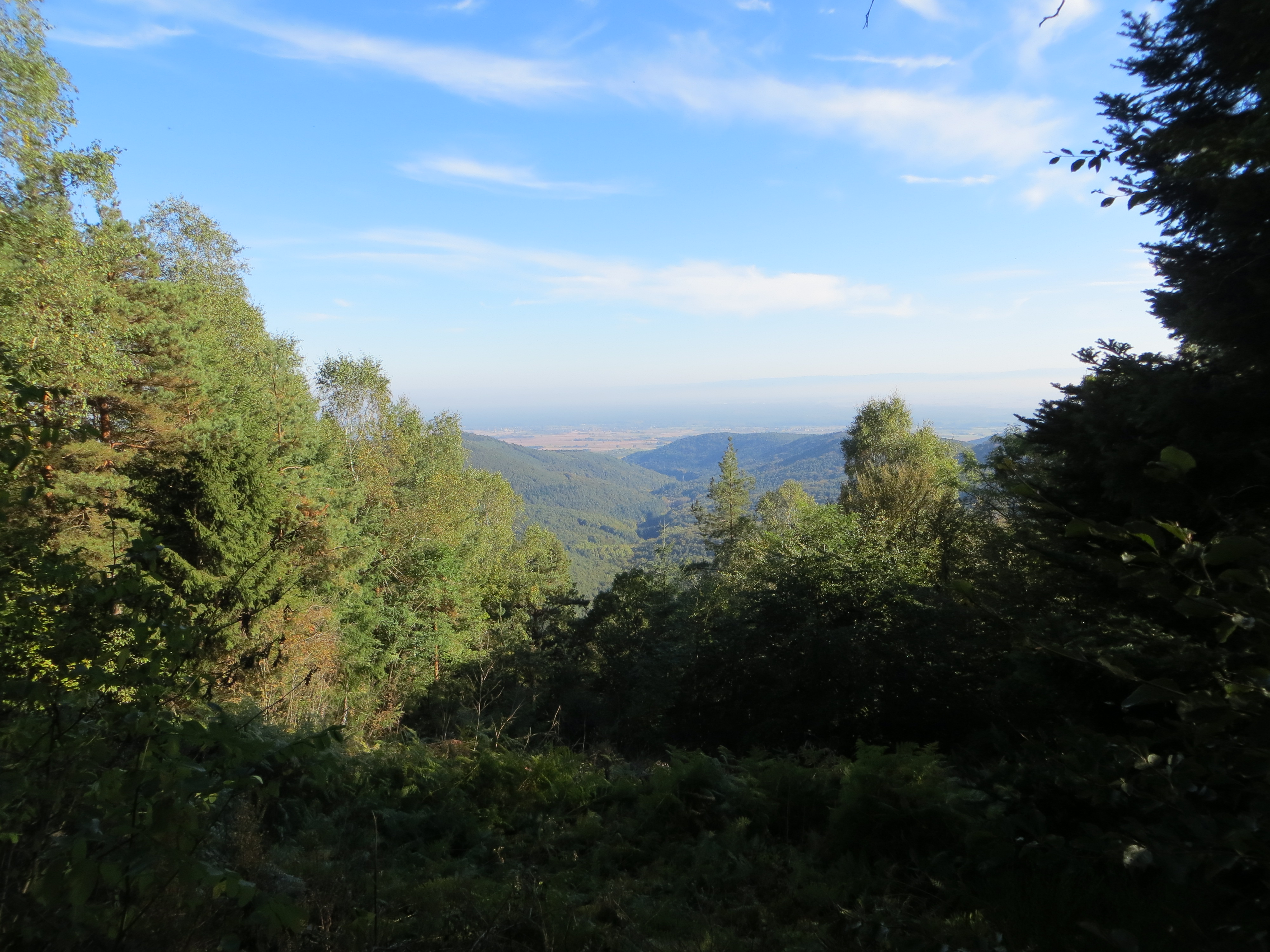 Der 24 m hohe Turm ist bekannt und gefällt durch seine großartige 360 Grad – Rundsicht, nicht so gefällig ist sein Äußeres: 1964 aus Beton erbaut, nachdem der 1888 erbaute Sandsteinturm 1947 infolge des 2. Weltkrieges gesprengt wurde; denn er wurde in dieser Zeit als Beobachtungsturm genutzt und war damit Teil des von dem 3.Reich errichteten Westwalls. Bevor wir also den Weg fortsetzten, genossen wir den Blick vom Turm. Zwar war der Blick in die Rheinebene zu diesem Zeitpunkt noch etwas getrübt, doch auf den Pfälzer Wald und die benachbarten Vogesen hatte man klare Sicht.