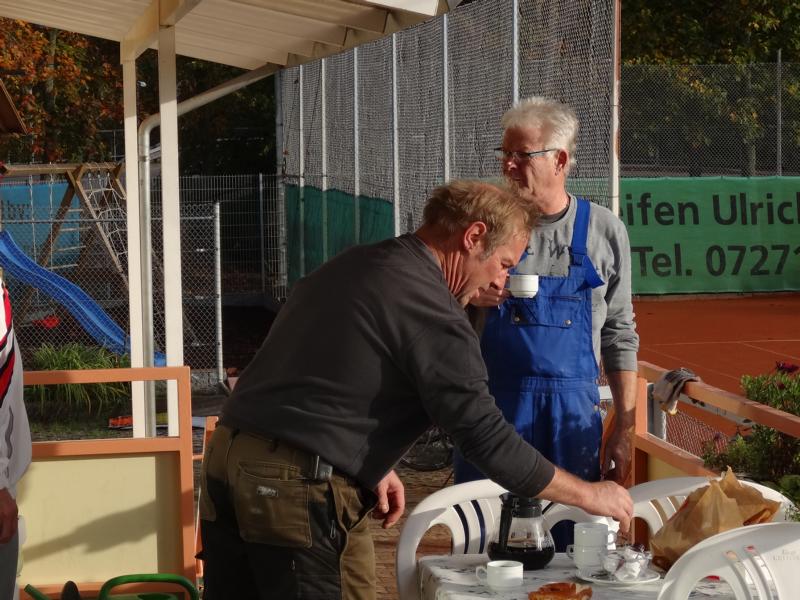 beim diesjährigen Herbstarbeitseinsatz am 18.10. wurde durch die wenigen Helferinnen und Helfer (9) in kürzester Zeit alle notwendigen Arbeiten, wie z.B. dem Abhängen der Sichtschutzplanen und Tennisnetze, Einsammeln der Platzpflegeutensilien, das Entleeren der Beregnungsanlage und der Reinigung des Kinderspielplatzes vom Laub (wie man am Ergebnis sieht) durchgeführt.
