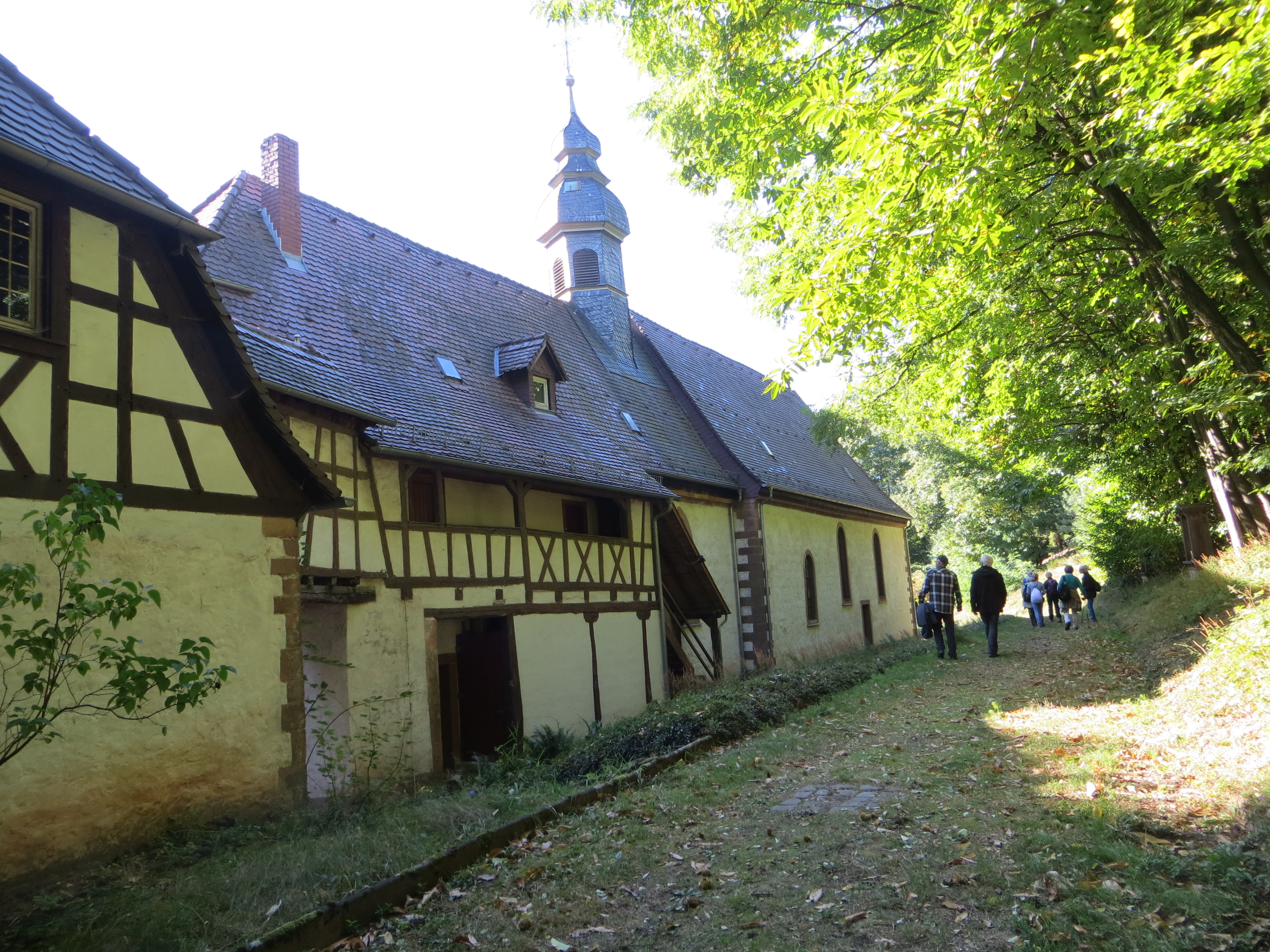 So begaben sich die 9 Teilnehmer in dem gut beschilderten Wandergebiet auf dem gemächlich ansteigenden Rundweg durch den bunten Herbstwald in Richtung Kolmerbergkapelle. Schon bald begleiteten uns auch die Sonnenstrahlen und auf dem Waldboden frisch gefallene und sehr große Esskastanien. Für Einige von uns war die Versuchung zu groß und so beschwerten sie frühzeitig damit ihr Wandergepäck. Dies war sowieso etwas umfangreicher; denn im Rucksack denn befand sich auch Essen und Trinken für unterwegs, da in diesem Waldgebiet leider keine Pfälzer- Wald- Hütte zu finden ist. Nach einer Stunde war die, auf 395 m gelegene Kolmerbergkapelle, erreicht. Sie ist eine beliebte Wallfahrtskappelle, deren Anfänge in das Jahr 1470 zurückgehen. Jedes Jahr werden immer noch an diesem schönen Platz im Wald Wallfahrtsfeste gefeiert. Nach einer kurzen Pause ging es weiter in Richtung Stäffelsbergturm. Dort angekommen, freute man sich auf die Mittagspause, die wir in 480 m Höhe und unter wärmender Herbstsonne genießen konnten.