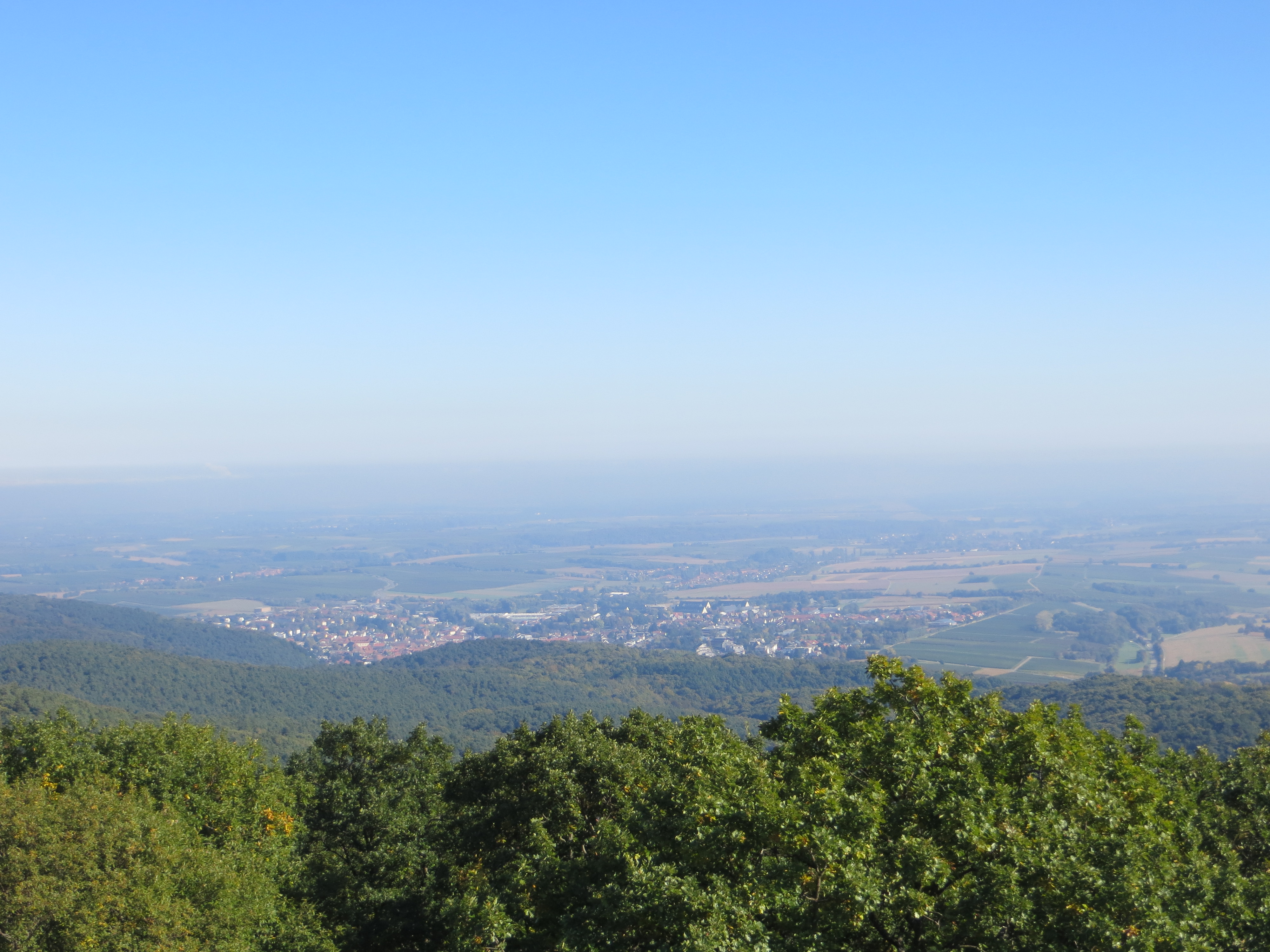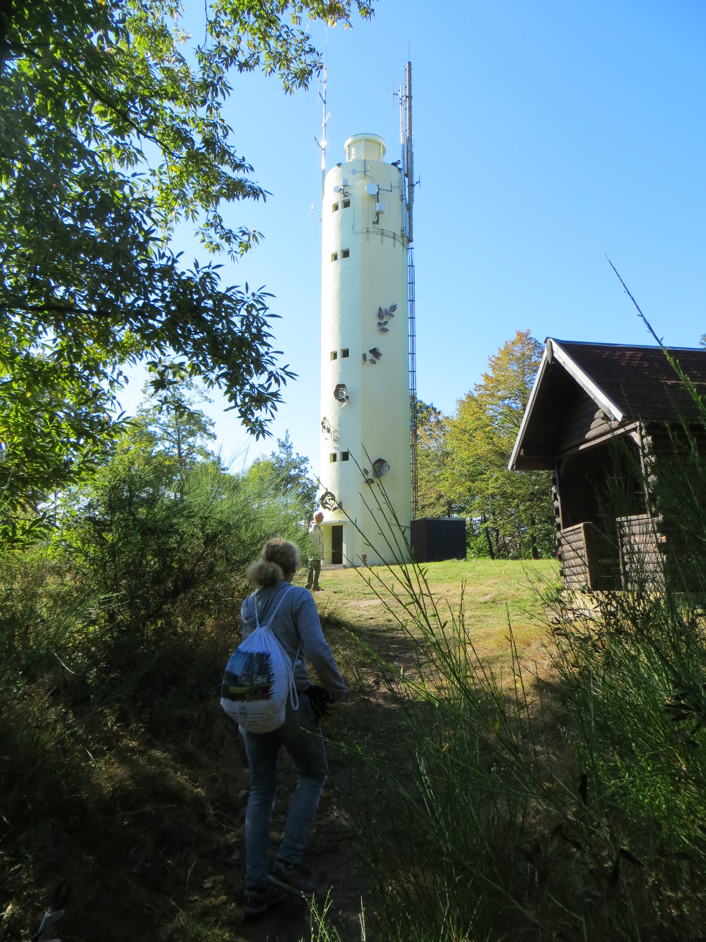 Der 24 m hohe Turm ist bekannt und gefällt durch seine großartige 360 Grad – Rundsicht, nicht so gefällig ist sein Äußeres: 1964 aus Beton erbaut, nachdem der 1888 erbaute Sandsteinturm 1947 infolge des 2. Weltkrieges gesprengt wurde; denn er wurde in dieser Zeit als Beobachtungsturm genutzt und war damit Teil des von dem 3.Reich errichteten Westwalls. Bevor wir also den Weg fortsetzten, genossen wir den Blick vom Turm. Zwar war der Blick in die Rheinebene zu diesem Zeitpunkt noch etwas getrübt, doch auf den Pfälzer Wald und die benachbarten Vogesen hatte man klare Sicht.