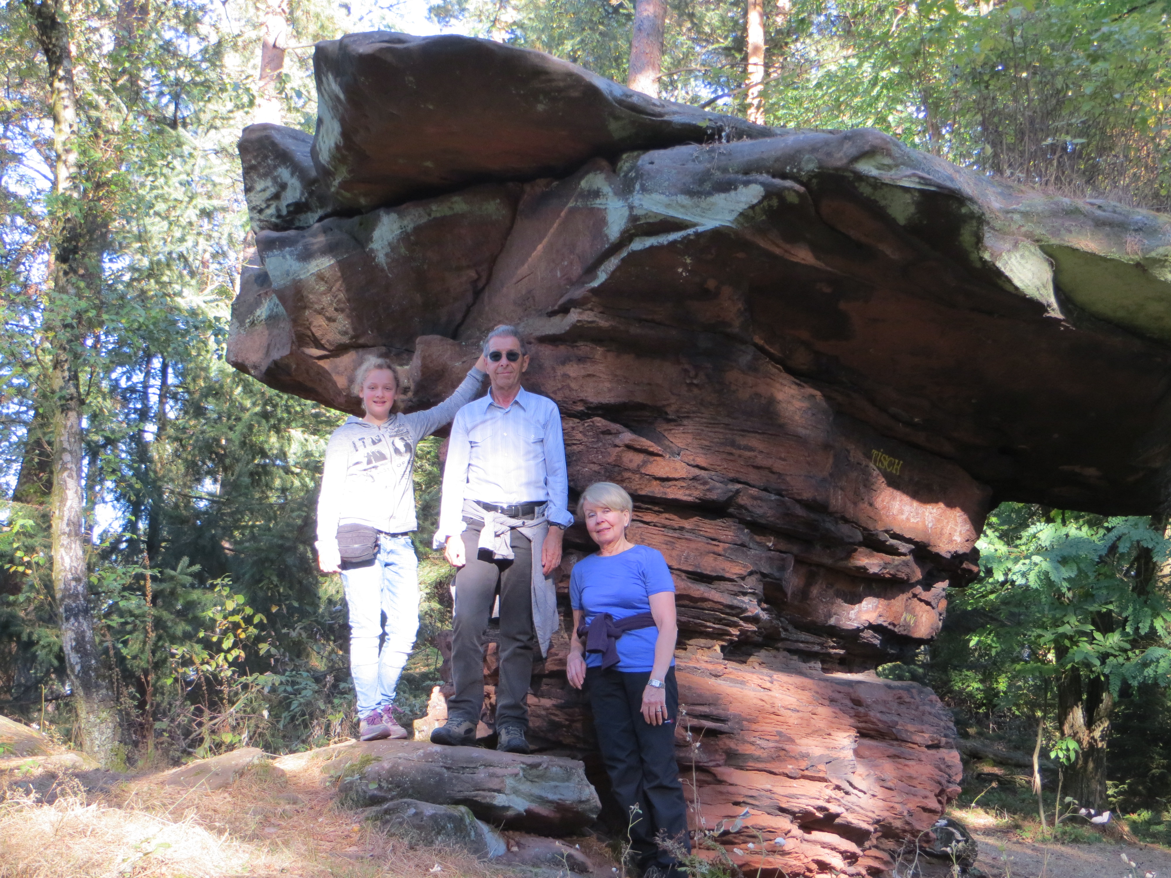 Auf dem Weg weiter Richtung Süd-Südwesten kamen wir ins Böllenborner Waldgebiet. Von den „3 Eichen“ ging es auf die Hohe Derst, wo wir in 543 m Höhe den „Steinernen Tisch“ bewundern konnten, ein Sandsteingebilde - sozusagen eine kleine Ausführung des Teufelstisches- das durch verschiedenstarke Erosion der unterschiedlich harten Sandsteinschichten diese bemerkenswerte Form erhalten hat. Nicht weit davon konnte man seinen Blick in Richtung Rheinebene schweifen lassen; diesmal bei vollkommen klarer Sicht.