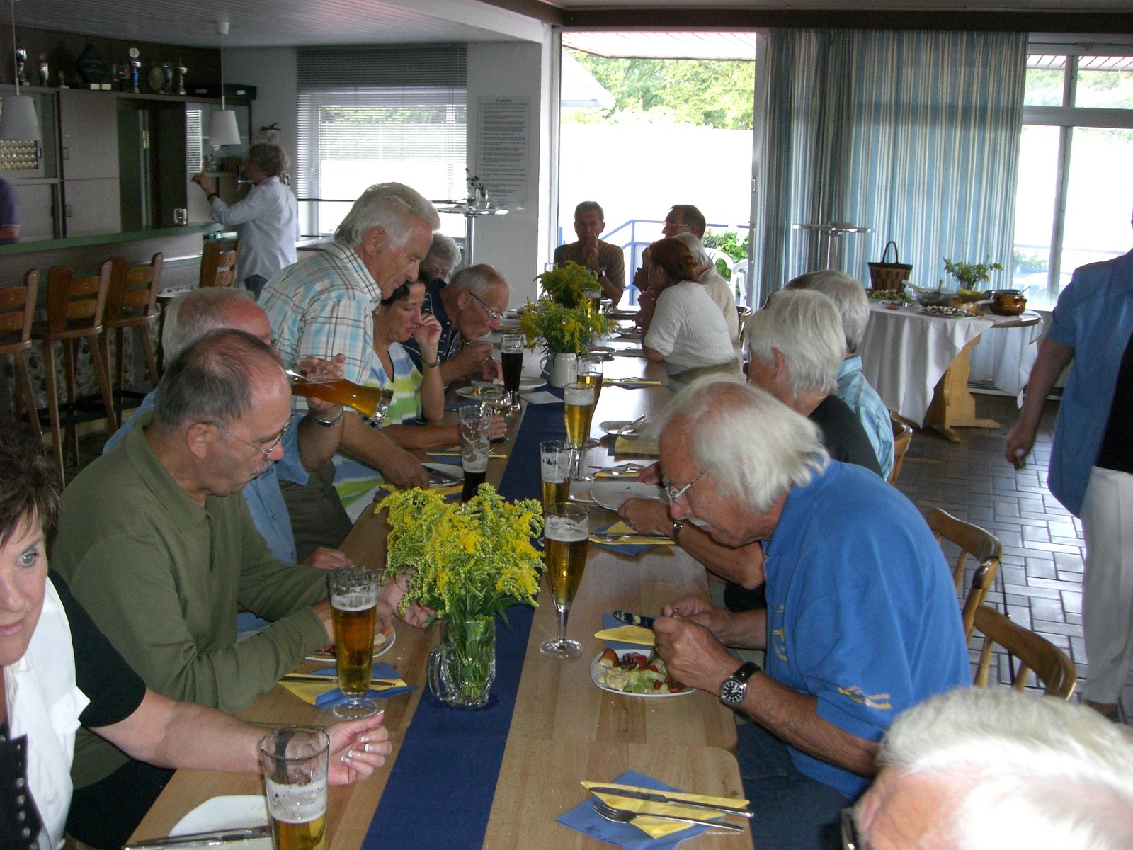 Das Wirtschaftsteam Kraus und Kurapkat hatte wieder die Mitglieder zur Teilnahme am Traditionsessen eingeladen und nach anfangs zögerlichen Eintragungen in der Meldeliste hatten doch noch 27 Teilnehmer den Weg ins Clubhaus gefunden. Als Vorspeise gab es ein buntes Salatbüffet welches allen vortrefflich mundete. In der Zwischenzeit wurden von Fred und Emmi die ersten