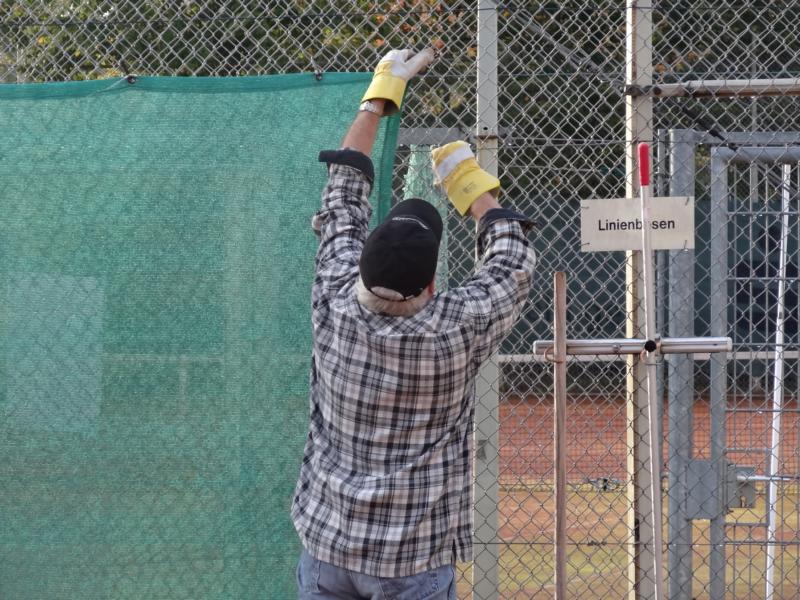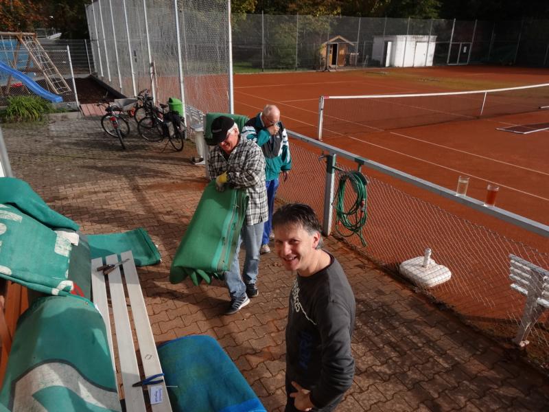 beim diesjährigen Herbstarbeitseinsatz am 18.10. wurde durch die wenigen Helferinnen und Helfer (9) in kürzester Zeit alle notwendigen Arbeiten, wie z.B. dem Abhängen der Sichtschutzplanen und Tennisnetze, Einsammeln der Platzpflegeutensilien, das Entleeren der Beregnungsanlage und der Reinigung des Kinderspielplatzes vom Laub (wie man am Ergebnis sieht) durchgeführt.